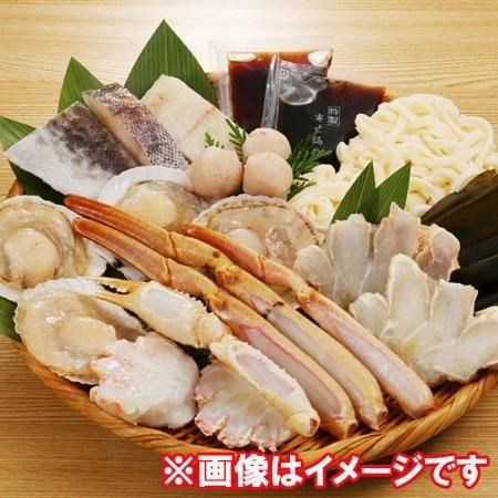 生たらばがに(肩)120g、生ずわいがにカット200g、真鱈切身3切(120g)、ほたて片貝3枚(180g)、かに入りつみれ3個、うどん250g、だし昆布15g、寄せ鍋のたれ50g×2